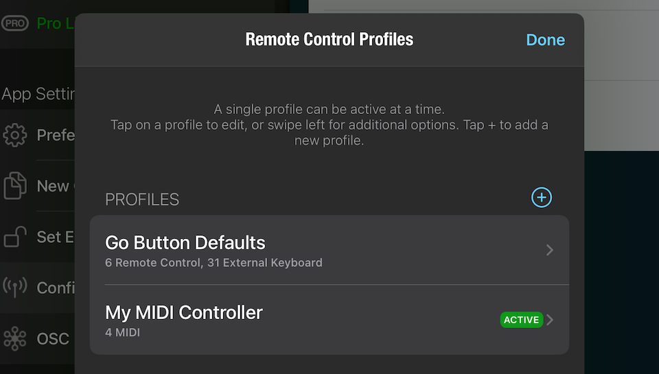 While the Profile Edit screen is open, you can press a button on your remote or a keyboard key, or send a MIDI message to Go Button to “learn” that input, i.e. capture it as a new remote trigger. You can also tap on the blue ”+” button to add a trigger of a specific type.