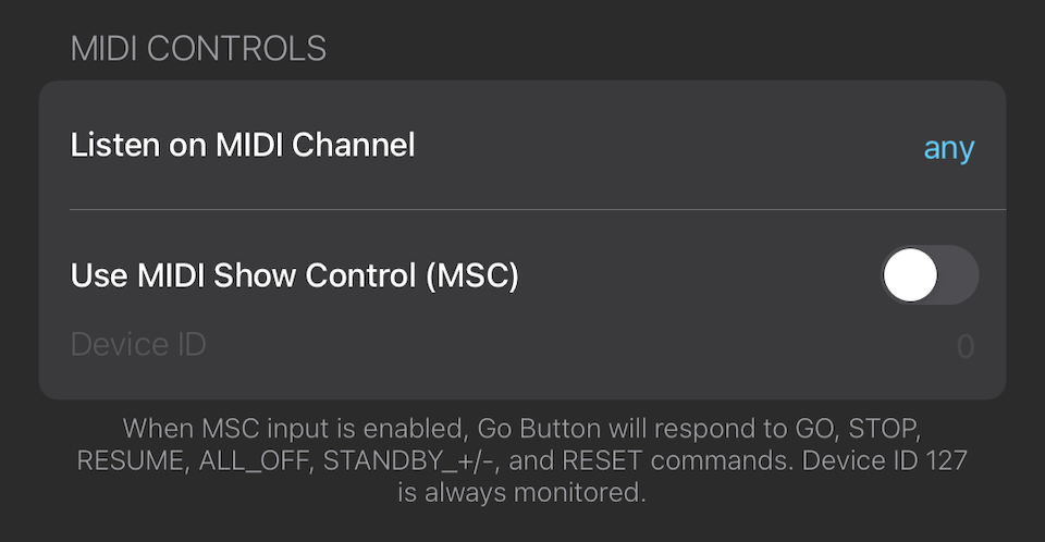 With that switch enabled, you need to set Go Button’s MSC Device ID, which is a number between 0 and 126. Every device on an MSC network must have a Device ID number, and must respond to incoming messages within their own categories if the messages are addressed to that Device ID. Also, all devices must respond to messages sent to Device ID 127.